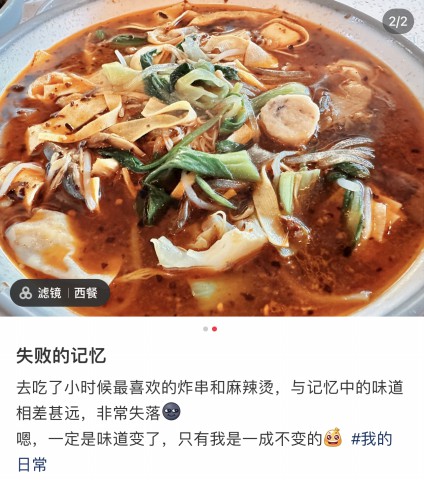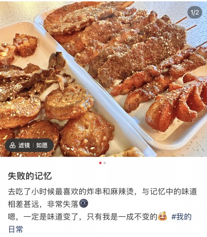 随后,林更新又晒出二次打卡沈阳儿时美食的图片“烤串”和“麻辣烫”,并配文“失败的记忆,去吃了小时候最喜欢的炸串和麻辣烫,与记忆中的味道相差甚远,非常失落。嗯,一定是味道变了,只有我是一成不变的”。