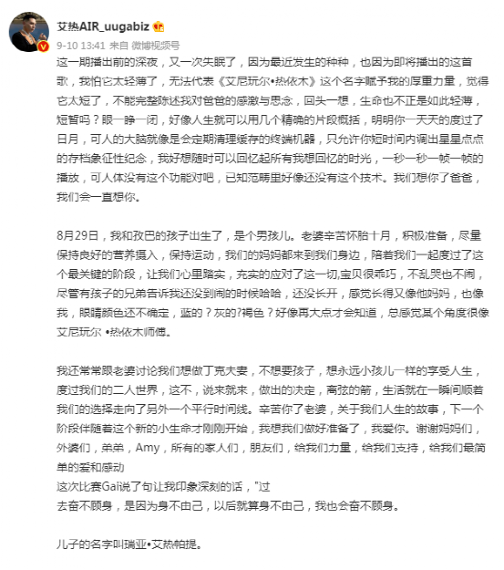 在总决赛舞台上,艾热AIR也借歌曲《艾尼玩尔·热依木》向大家透露,他已经当爸爸了。“还没长开,感觉长得又像他妈妈,也像我,眼睛颜色还不确定,蓝的?灰的?褐色?好像再大点才会知道,总感觉某个角度很像艾尼玩尔 •热依木师傅”。