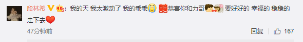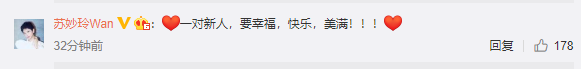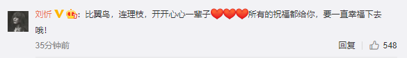 随后其好友刘忻转发此博送上祝福:“比翼鸟,连理枝,开开心心一辈子。所有的祝福都给你,要一直幸福下去哦!” 喻佳丽在评论区回复她:“我的忻爱你哦,伴娘小裙子请签收,哈哈哈”。李斯丹妮、段林希、陆翊、苏妙玲等也纷纷送上祝福。
