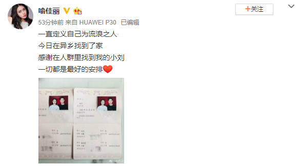 3月5日,喻佳丽晒出结婚证,宣布结婚的喜讯:“一直定义自己为流浪之人,今日在异乡找到了家,感谢在人群里找到我的小刘,一切都是最好的安排。”