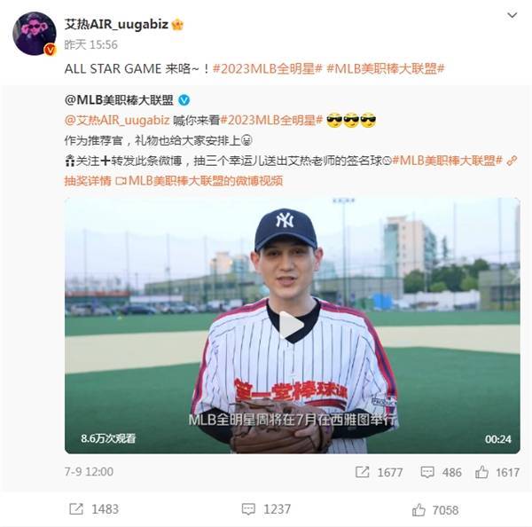 7月9日,MLB美职棒大联盟官宣艾热AIR(D.M.G)担任MLB全明星推荐官,为7月在西雅图举行的MLB全明星周助阵。此次艾热与MLB全明星周的跨界合作,不仅是为棒球运动在国内的普及贡献一份力量,也表明了中国说唱文化在国际市场的影响力。据了解,艾热还将出席8月份在美国洛杉矶由MLB发起和举办的Hiphop50周年秀。